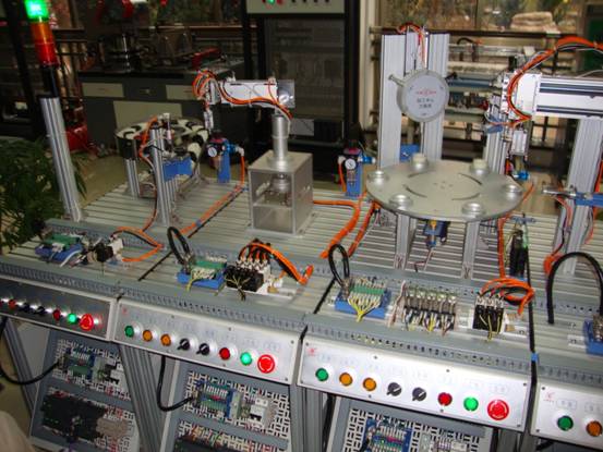 实训项目简介:主要完成PLC技术、变频器、触摸屏技术、交流伺服技术、步进驱动技术、工业机器人、机器视觉系统等综合应用设计、安装、调试,模拟实际情况进行仿真教学。