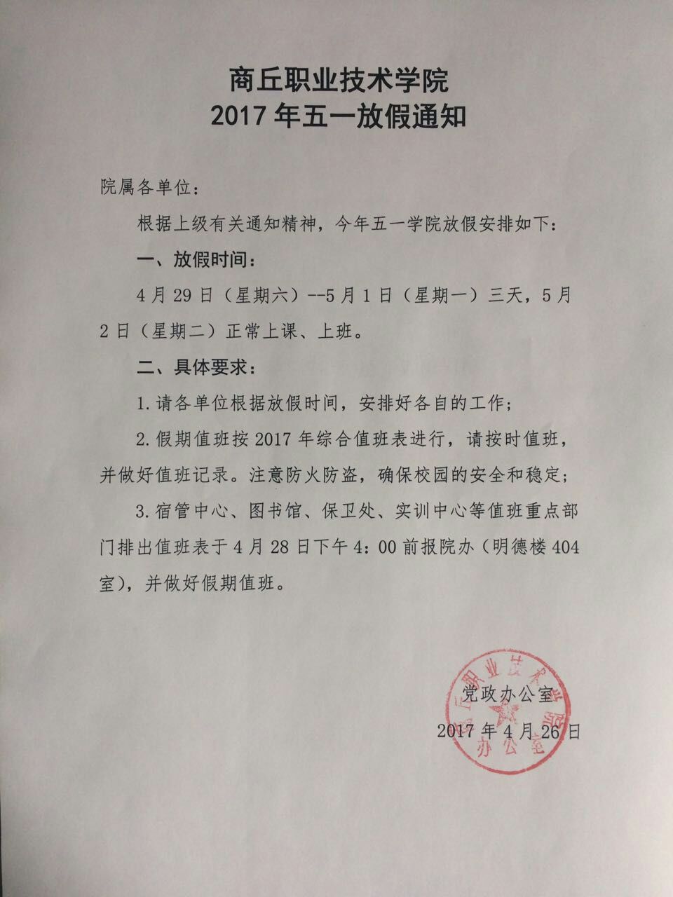 3.宿管中心、图书馆、保卫处、实训中心等值班重点部门排出值班表于4月28日下午4:00前报院办(明德楼404室),并做好假期值班。